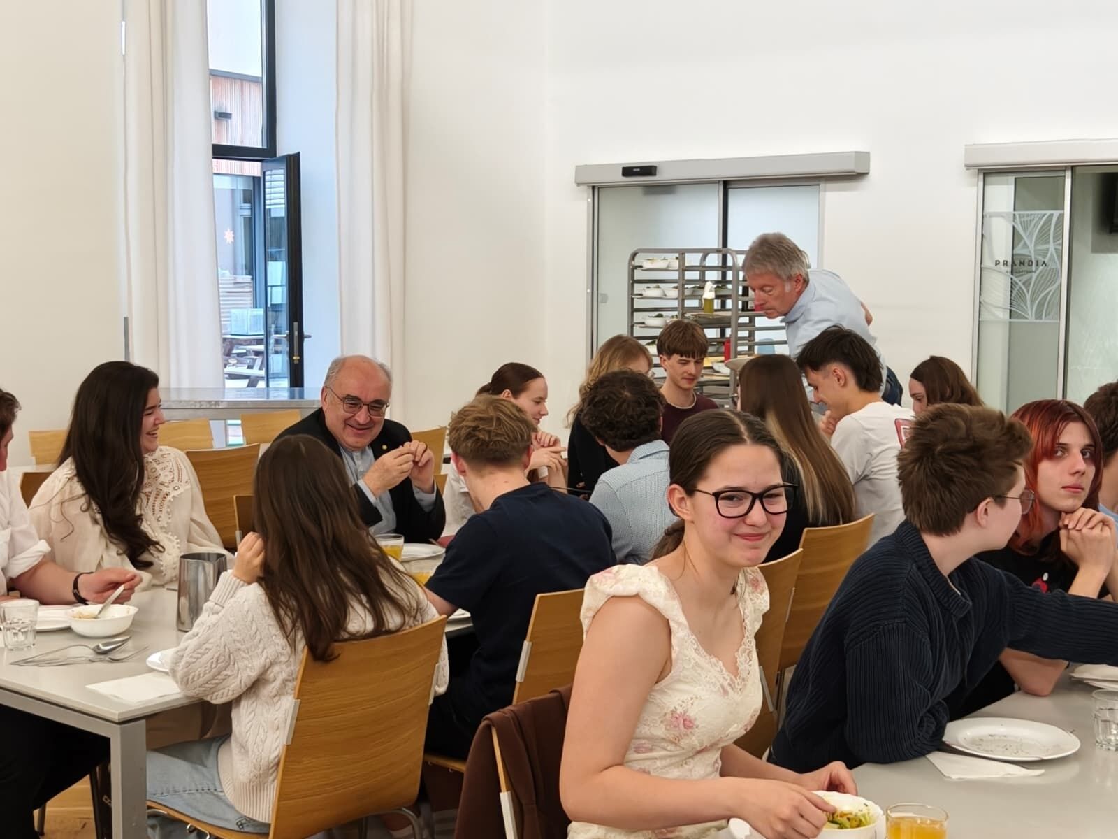 Ein besonderer Abend für unsere Internatsgemeinschaft: Bischof Wilhelm Krautwaschl war bei uns zu Besuch und nahm sich viel Zeit für Begegnung und Austausch. Bereits beim Abendessen saß er gemeinsam mit unseren Maturant:innen am Tisch – unkompliziert, offen und mitten im Geschehen.