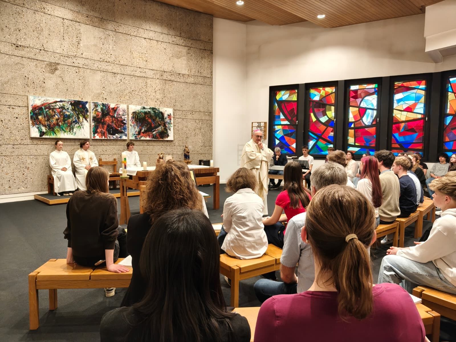 Danach ging es in einer offenen Austauschrunde weiter, in der unsere Jugendlichen neugierig nachfragten – und spannende Einblicke in das Leben eines Bischofs erhielten: ein dicht gefüllter Terminkalender, kaum freie Zeit, nur zweimal im Jahr Urlaub, Aufregung vor Live‑Fernsehauftritten und auch amüsante Geschichten hinter den Kulissen von ORF‑Interviews. Ebenso ehrlich sprach der Bischof über das Schreiben von Predigten, Künstliche Intelligenz und über die Auswirkungen von Social Media auf unser Miteinander.