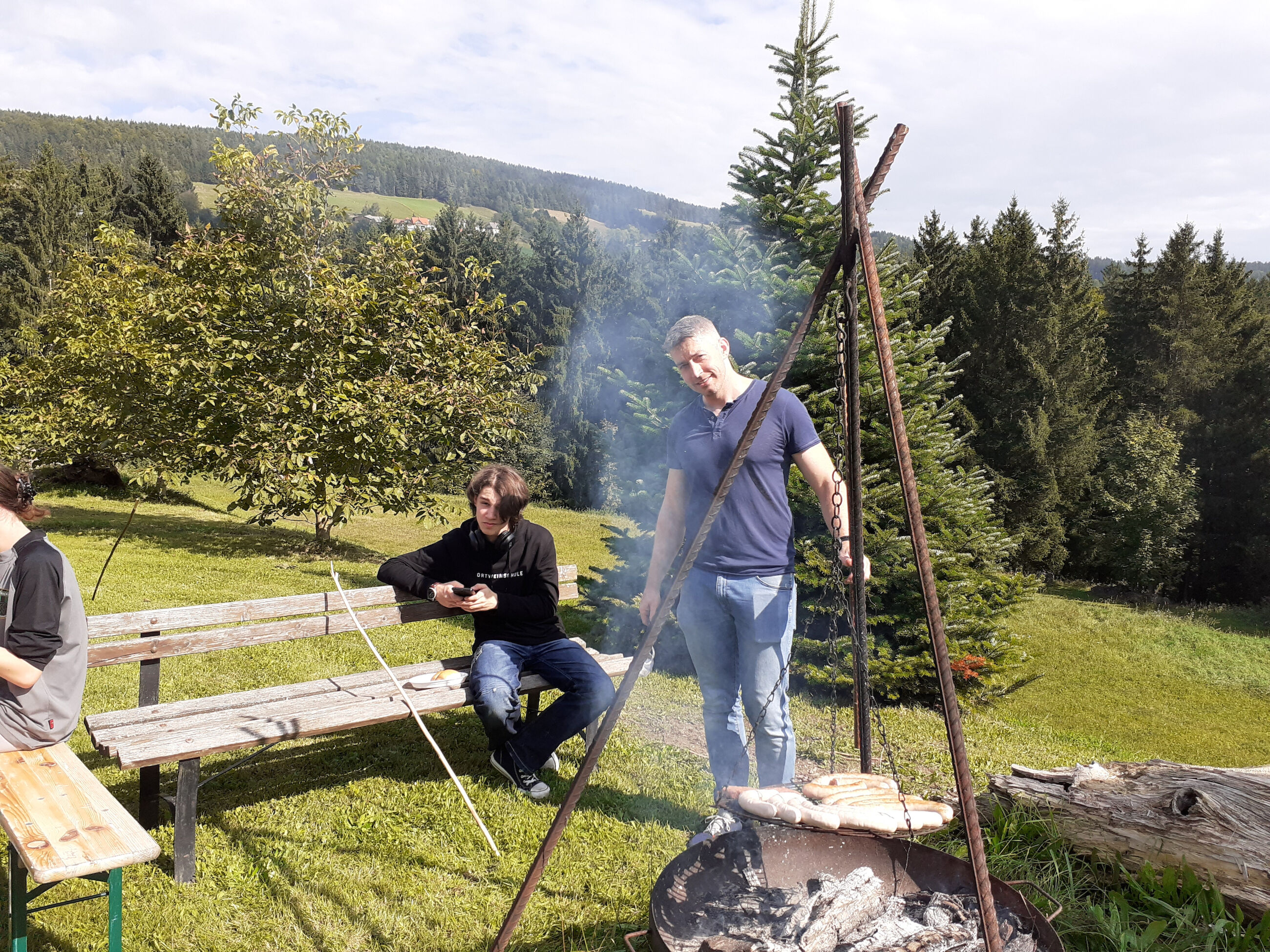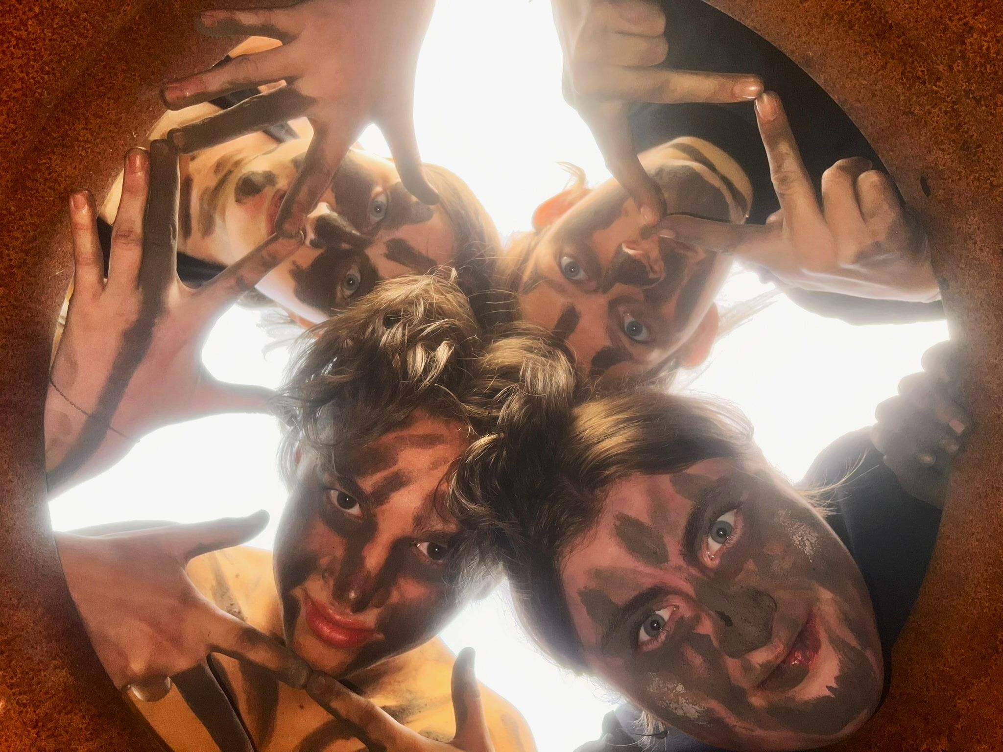 Wie anstrengend das Bogenschießen sein kann war für viele überraschend - die Zugkraft, die für das Spannen der Bögen benötigt wird ist enorm und geht ganz schön in die Arme! Da kam es dann ganz gelegen, dass zu Mittag ein Lagerfeuer entzündet wurde, an dem sich alle versammelt haben und leckere Würstchen und Erbsenproteinlaibchen (ja, auch an die Vegetarier wurde gedacht) über dem Feuer gegrillt haben. Das Hantieren mit Pfeil und Bogen musste dann wohl auch urzeitliche Instinkte in unseren Jugendlichen geweckt haben, die nach der nächsten Bogenschießsession zum Vorschein kamen. Einige unserer Schüler:innen konnten der Asche des Lagerfeuers nicht widerstehen, legten Kriegsbemalung an und erkundeten die Fauna und Flora in der näheren Umgebung.